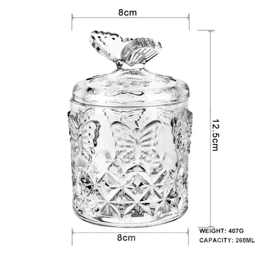 Емкость для хранения и подачи. Подойдет прекрасно под небольшие продукты по типу орехов, цукатов и т.д., а так же для сыпучих продуктов. Характеристики: • Размеры: 8*12,5 см. • Объем: 260 мл. • Стекло