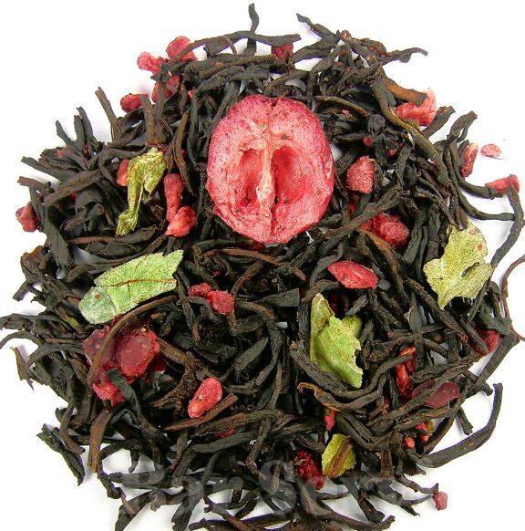 Гибискус, цукаты ананаса, ягоды ежевики и красной смородины, кусочки яблока.